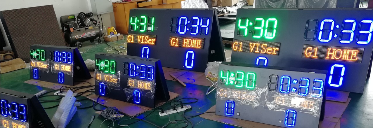 Master scoreboard with dimension 1688mm(W) x 896mm(H) , team name max to 8 charaters. Slaves scoreboards with 6inch digits, size to 996mm(W) x 518mm(H).